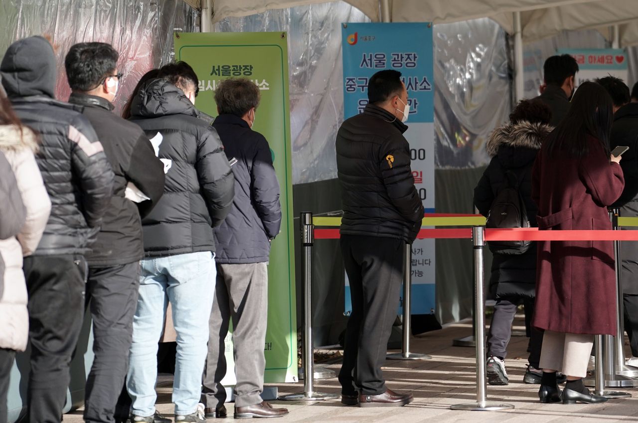 ▲南韓近來單日新增確診始終維持4、5千例,圖為首爾市廳廣場的篩檢站。(圖/達志影像)