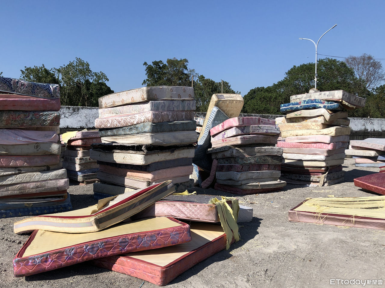 ▲堆積上千大型床墊只能仰賴委外處理,預計接下來將以一天70塊的處理速度,分20天逐批消化,可望在本月底前全數破碎完成。(圖/記者蔡佩旻翻攝)