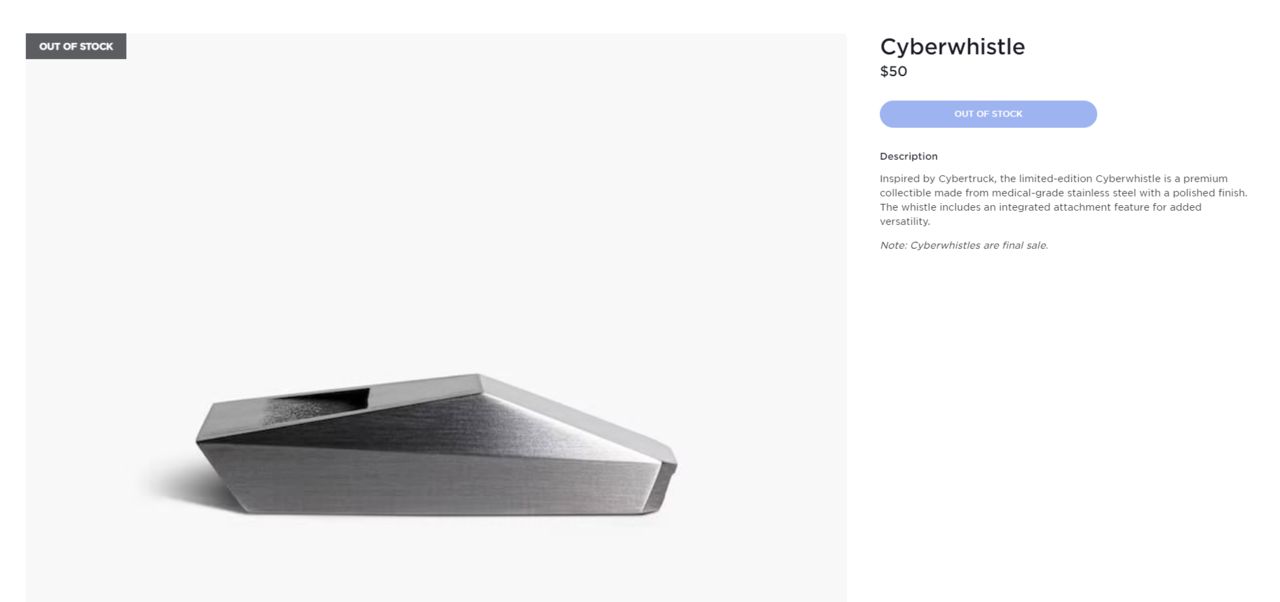 ▲要價50美元的特斯拉的哨子Cyberwhistle,上架3天真地賣到缺貨。(圖/翻攝自特斯拉官網)