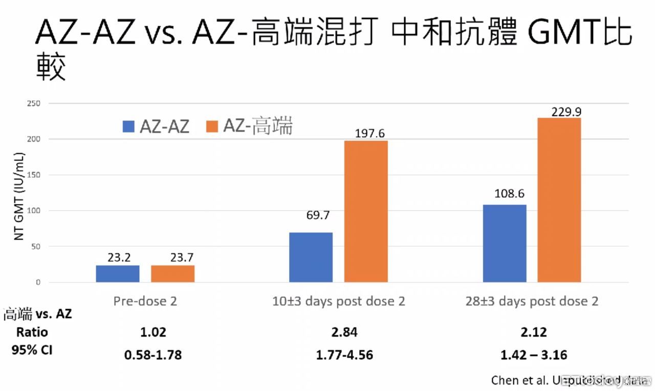結論顯示,混打AZ與高端疫苗,不論血清抗體生成性,或細胞免疫反應,都優於兩劑AZ。混打AZ與高端,是可行的疫苗應用策略,實際施打時,盡量在間隔4-6週內混打,可取得較佳的抗體反應。
