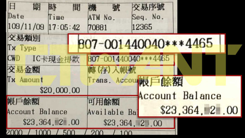 據CTWANT獨家取得ATM交易明細表中,林秉樞在永豐銀行末四碼4465的帳戶中,可用餘額竟超過2300萬元,不過身懷鉅款的他,卻連平時入住飯店的房錢,還要小女友幫忙付錢。