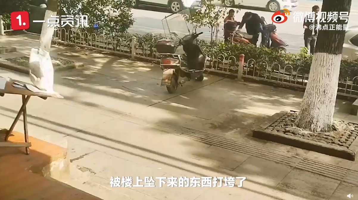 湖北陽新縣一名男童在路旁寫作業時,發現一名男子騎車摔倒,他立即上前幫忙扶起對方,沒想到原本坐的地方突然被高空墜物擊中,讓他因為熱心助人意外逃過一劫。