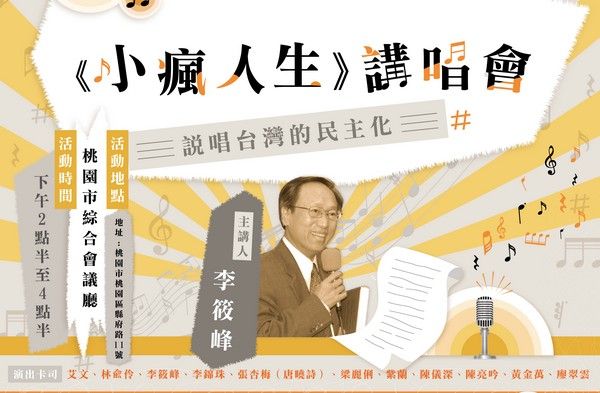 知名臺灣史研究學者李筱峰即將在桃園新書講唱!桃園市立圖書館於12月12日下午2點半,於桃園市綜合會議廳舉辦《小瘋人生》講唱會,活動邀請到重量級歌手陳亮吟、紫蘭、艾文等人,現場演唱經典歌謠每首都精采可期,盼望透過美好的音樂勾起大家的回憶,亦提升民眾對於閱讀文學作品的興趣。