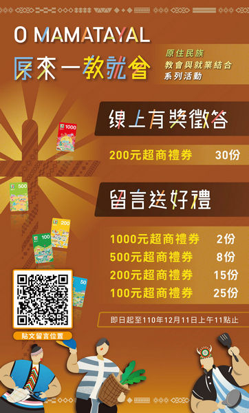 「O MAMATAYAL原來一教就會-就業福音媒合會暨網路直播活動」網路雙響炮,一個是網路「留言抽好禮活動」自即日起到12月11日上午11:00止,到原民局臉書粉絲頁留言,就可抽獎。另一個是當天上午9:40~10:55進行現場線上直播,針對宣導內容辦理有獎徵答,有請網民熱烈上線相見。