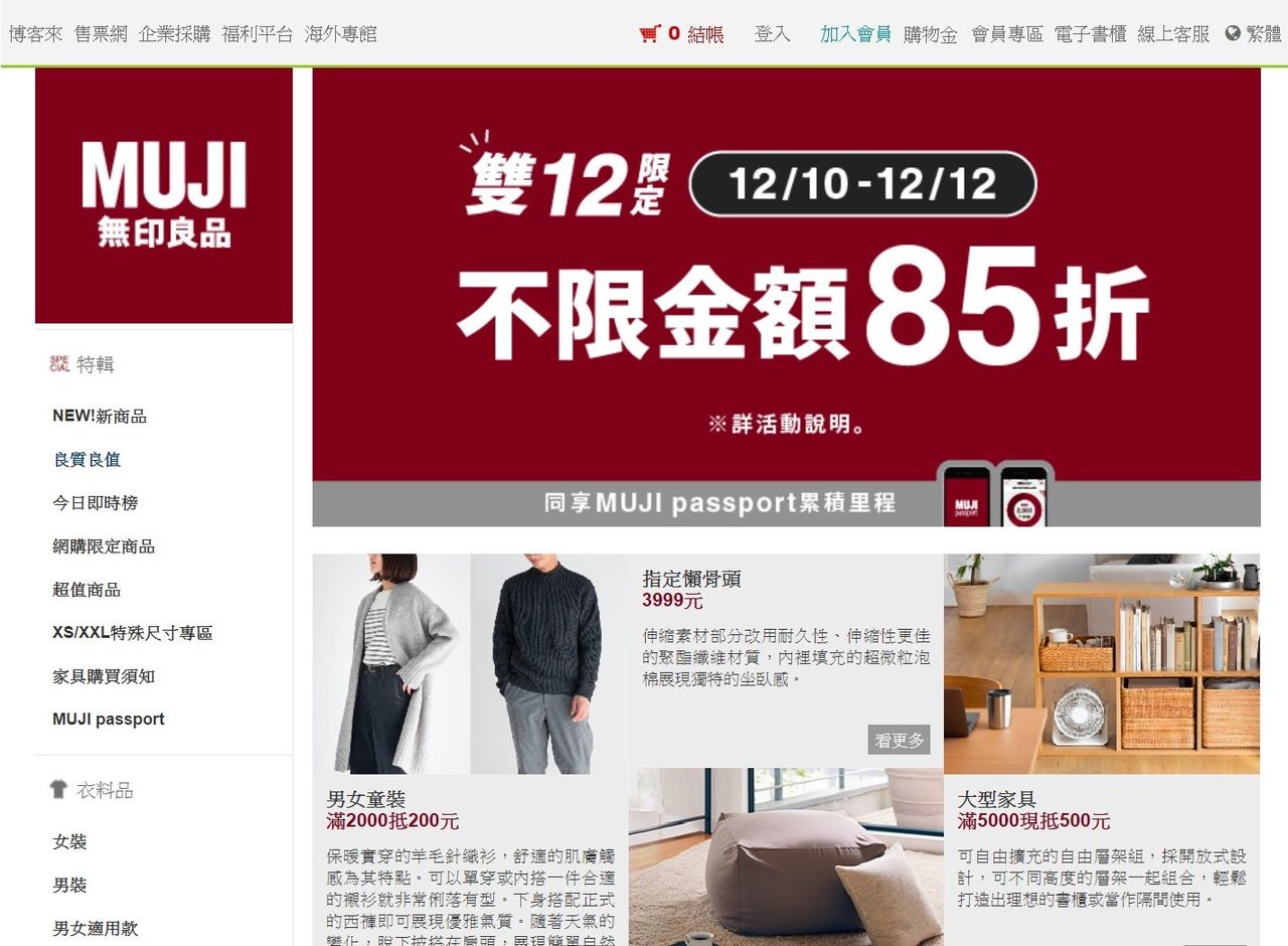 ▲博客來MUJI無印良品館雙12不限金額結帳85折,活動限時三天。(圖/翻攝自博客來)