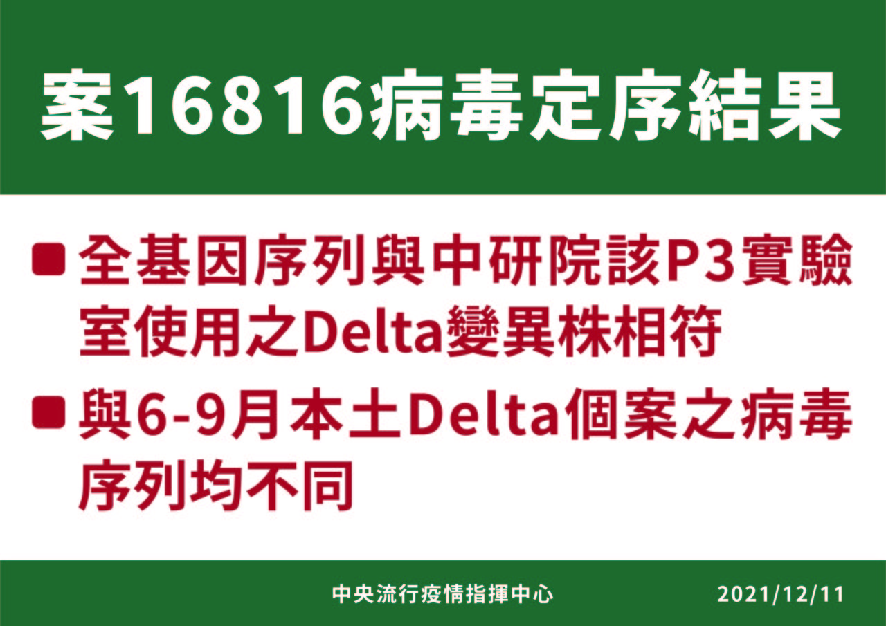 中研院P3實驗室的本土病例(案16816)為本國籍20多歲女性,曾任中央研究院基因體研究中心實驗室研究人員,近期無出入境紀錄,已接種2劑莫德納疫苗。個案於11月中旬工作過程曾接觸過病原,當下並無症狀;11月26日開始出現輕微咳嗽,12月4日咳嗽加劇,12月8日出現嗅、味覺異常,就醫採檢後確診,初步研判感染Delta變異株。指揮官陳時中今日宣布,全基因序列與中研院實驗室相符,現在可以判定跟社區不同,是實驗室的病毒。