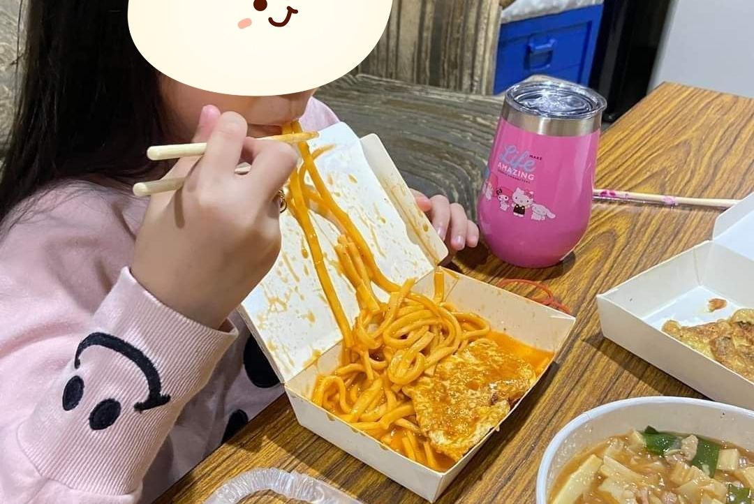 原PO在臉書社團「爆廢公社」貼出照片,從中可見,他國小4年級的女兒用筷子夾住炒麵,一邊把麵條送入口中大快朵頤,一邊把盒蓋當盤子使用,