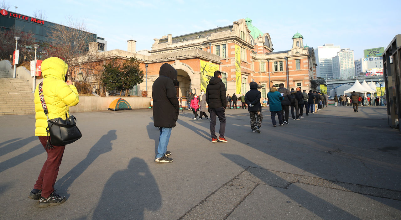 ▲南韓首爾車站篩檢站大排長龍。(圖/達志影像)