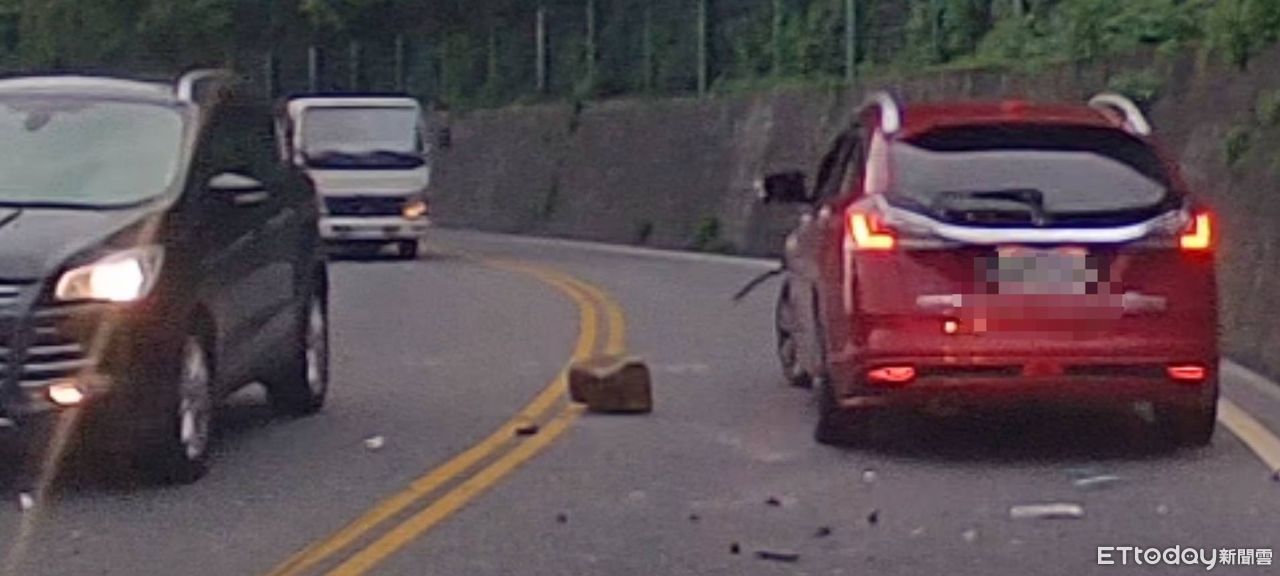 ▲蘇花公路又傳落石,落石掉在北向車道上,遭前車撞飛砸向對向的紅色小客車。(圖/記者王兆麟翻攝)