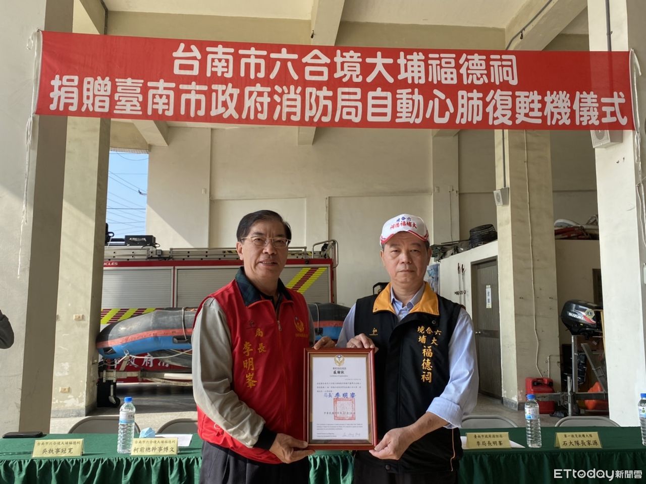 ▲台南市六合境大埔福德祠,捐贈總價值新台幣50萬元的自動心肺復甦機1台,由台南市消防局局長李明峯代表受贈,並回贈感謝狀。(圖/記者林悅翻攝,下同)