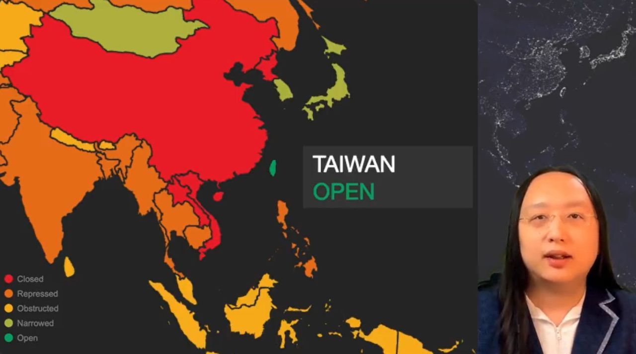 ▲唐鳳民主峰會視訊畫面因台灣、中國顏色標註不同,被白宮要求「卡掉畫面」。(圖/翻攝推特)