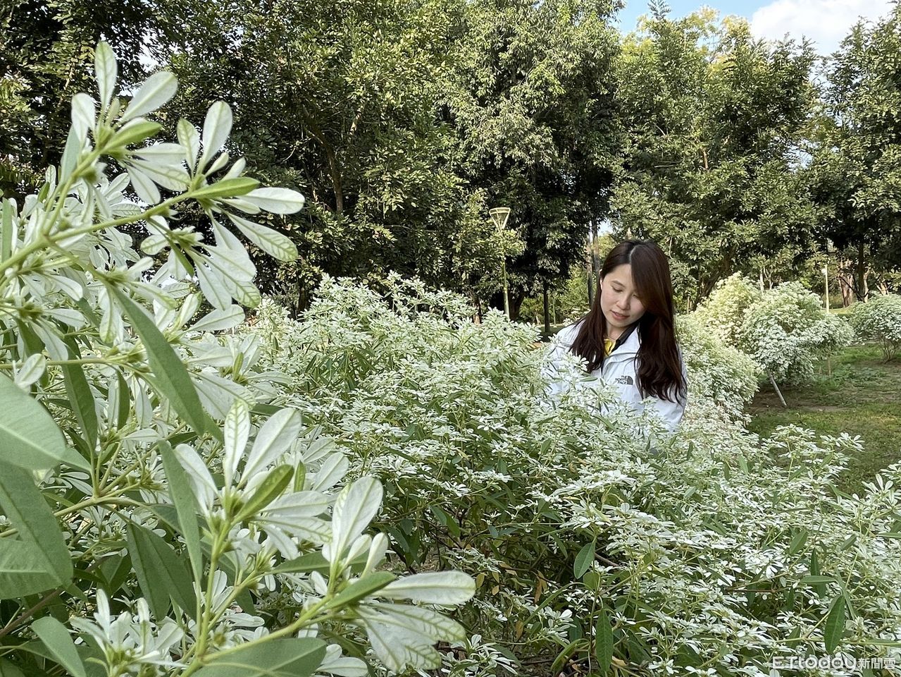 ▲台南山上花園水道博物館園區內的白雪木卻正欣欣向榮,一整片雪白花葉,美不勝收。(圖/記者林悅翻攝,下同)