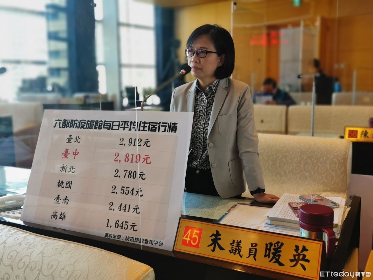 台中市議員朱暖英今天在質詢時表示,依據網路公開的檢疫旅館六都行情,台中市每日平均住宿價格只比台北市低,高居第二,民眾每天平均需花2819元住宿費用。如果以7天入住計算,要花費1萬9733元;若春節行情調漲到一天4000元,則7天下來就要支付2萬8000元,負擔其實相當重。