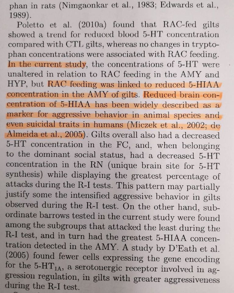 蘇偉碩表示,論文作者除了在摘要中指出餵食萊劑豬隻出現攻擊性增強原因,可能經由間接影響大腦調節系統所致,包括大腦調節攻擊行為的區域如杏仁核的血清素系統與多巴胺系統出現失調;作者還在討論中暗中提醒,血清素代謝物5-HIAA的降低已經在許多研究中被廣泛描述與動物的攻擊行為和人類自殺傾向的生化指標。