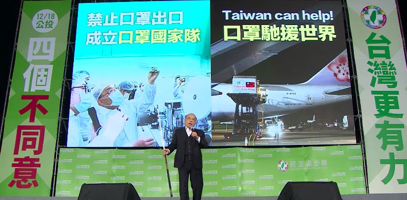 民進黨在17日「公投之夜」舉行台北、高雄兩場造勢活動,高雄場由行政院長蘇貞昌打頭陣。蘇貞昌再次向在場將近3萬民眾訴求「四個不同意」,並提醒國人,台灣如果沒有辦法加入CPTPP,台灣的東西要怎麼出口,要怎麼來競爭?