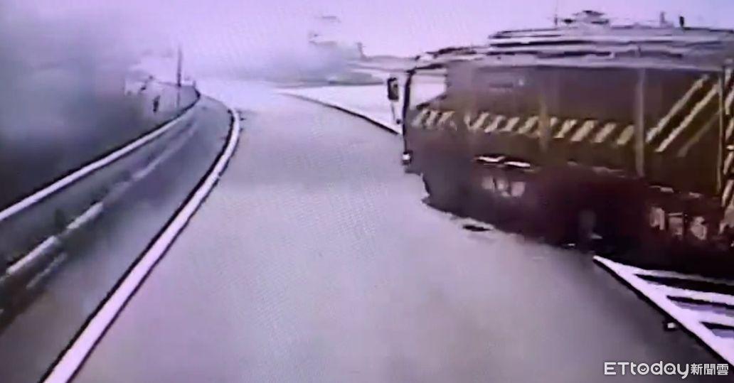 ▲當事消防車直接向左切出,拖板車駕駛閃避不及撞上 。(圖/記者唐詠絮翻攝)