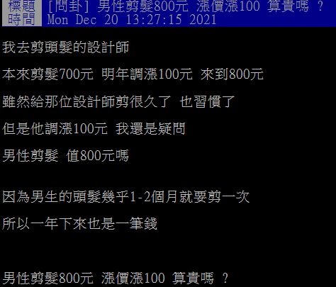 一名網友在PTT「Gossiping」版以「男性剪髮800元 漲價漲100 算貴嗎 ?」為題發文,表示平時常去的髮廊原本剪髮價格為700元,但為他剪髮的這名設計師明年調漲100元,雖然給那位設計師剪很久了,也習慣了,並表示以前原始價格為400元,多年來漲到700元,「我覺得差不多是我的極限了吧」,認為男生的頭髮幾乎1到2個月就要剪一次,所以一年下來也是一筆錢,詢問網友「男性剪髮值800元,漲價漲100,算貴嗎?」
