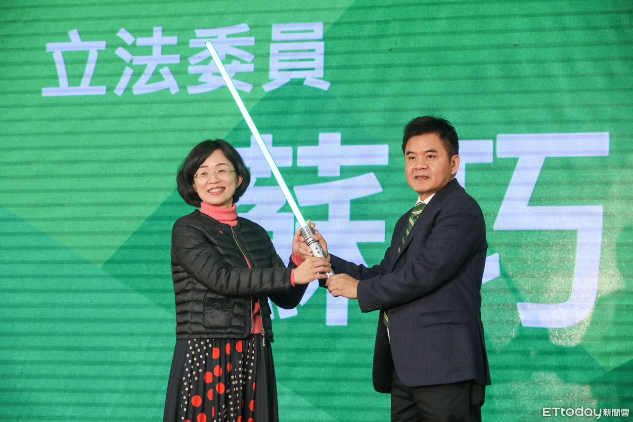 隨後,蘇巧慧也送上象徵進步力量的星際大戰綠色「光劍」。蘇巧慧表示,今年公投的過程中,蘇貞昌全台走訪72場說明會,而這72場中最著名的就是「撞球桿」,現在要有新時代的科技感,撞球桿是蘇貞昌,科技感就是接棒的莊瑞雄。