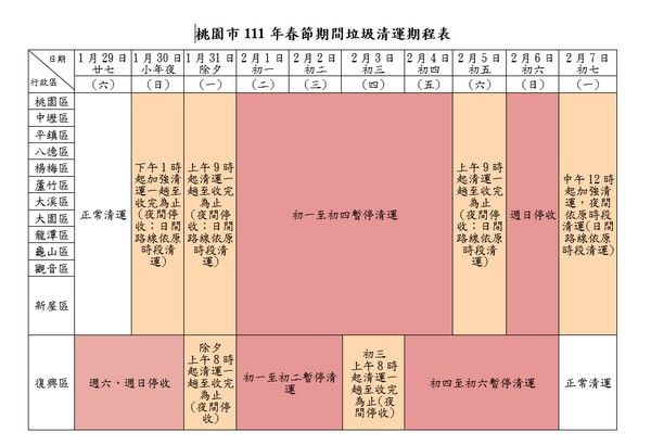 環保局在2月5日也就是初五這天,各區清潔隊提早收假歸隊,協助市民清理過年4天堆積的垃圾,當天自上午9時起,針對各清運路線加強收運一趟至收完為止,夜間則停收;2月7日特別自中午12時起開始清運,讓市民朋友增加倒垃圾的時間,夜間則恢復正常清運垃圾;另復興區則是2月1日、2月2日、2月4日、2月5日及2月6日等五天停收,而1月31日及2月3日自上午8點起,清運一趟至收完為止,夜間停收。