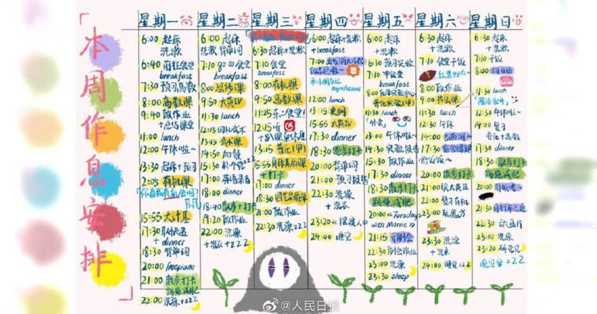 ▲學霸的一日作息表,讓網友看完都很震撼。(圖/翻攝自人民日報微博)