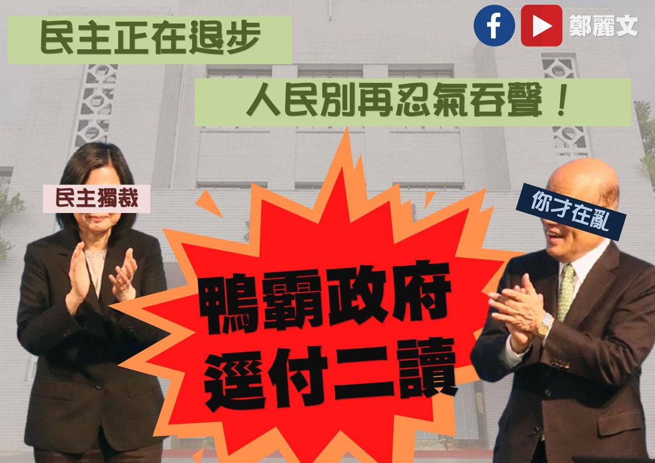 民進黨立法院黨團21日「突襲」國民黨團,將110年中央政府總預算案公務預算部分從立院各委員會抽出,再挾人數優勢直接逕付二讀,創國會全面改選30來首例。對此,國民黨立委鄭麗文22日批評,總預算高達2兆元,但執政黨為了通過,擅自替過初審程序,這算什麼民主進步?如此荒誕的行徑,蔡獨裁真是踏了歷史性的一大步,簡直是民主獨裁的政治坦克。