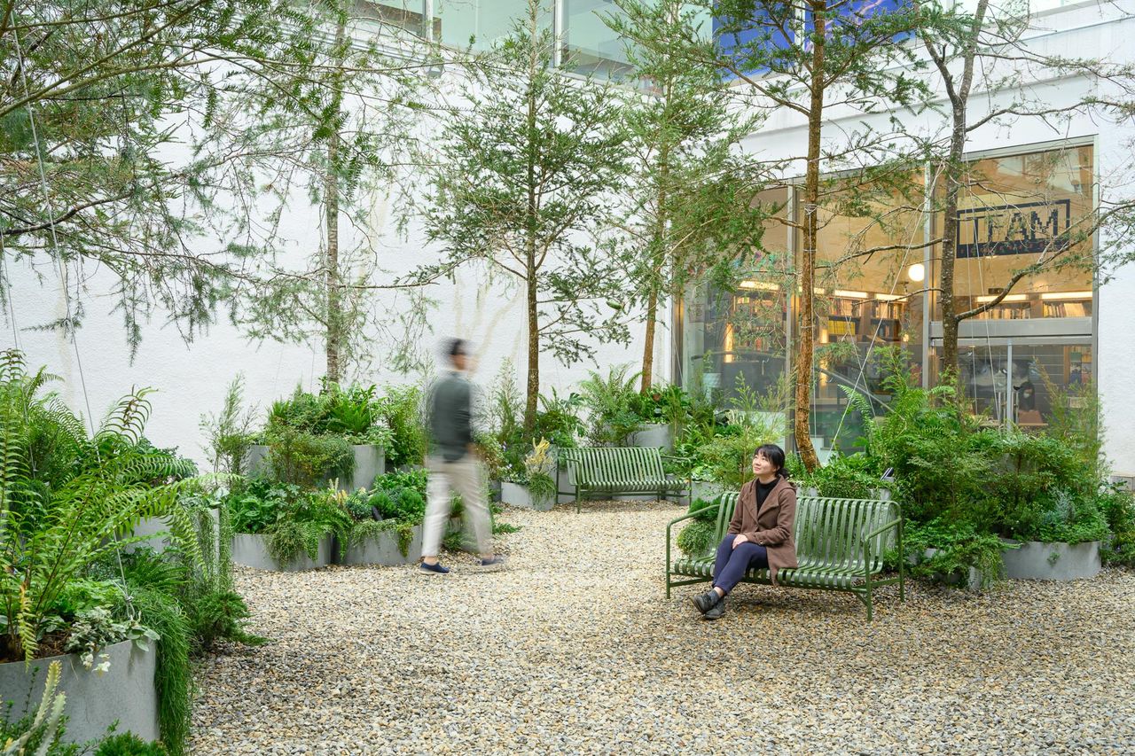 除了非日常的參與式互動展演之外,透過色彩,北美館持續將美術館的場域從展間打開,像是地下樓的公共服務區域改以沉穩的色調鋪陳,搭配深色木質的弧型長椅及圓桌,不僅使圓融韻律走入空間意向,觀眾也可以在此駐足、感受藝術觸動人心的特質。由此凝視藝術家吳書原+耿寧於中庭現地製作的《迷霧花園》作品,清新的杉林質調呼應館內、館外自然質樸的氛圍,讓人享受當下的靜謐與緩慢。