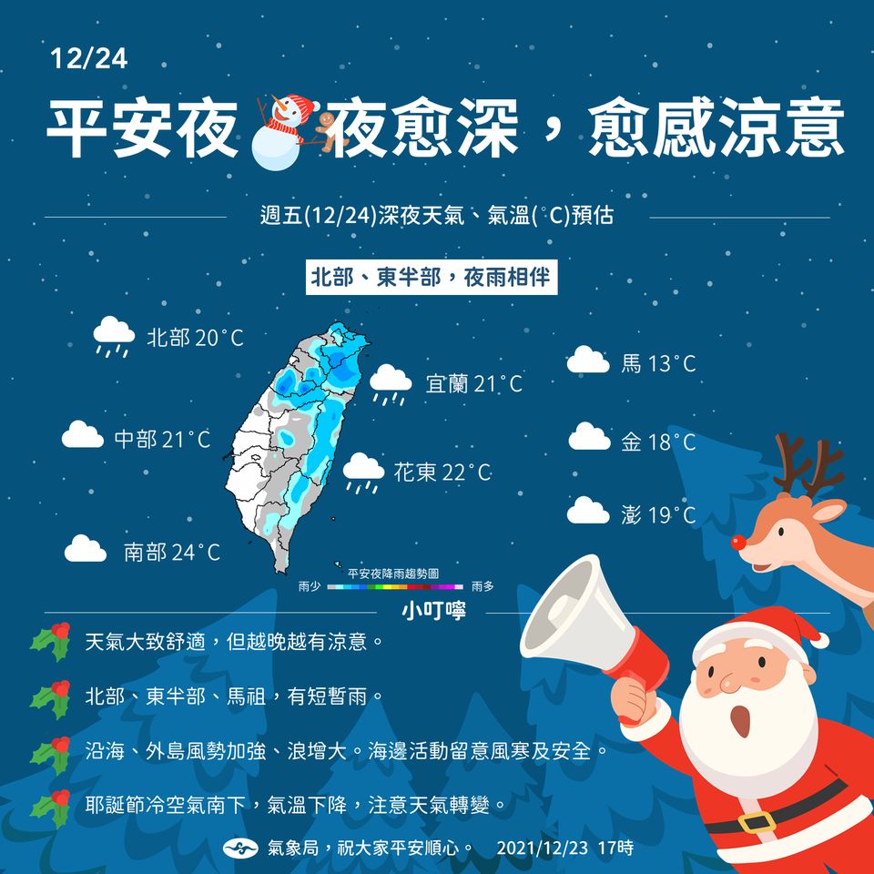氣象局在臉書貼文指出,明晚的平安夜越晚越涼,北、東半部入夜有局部短暫雨,中南部多雲、山區偶雨,北部、東北部20到21度,花東22度,中部21度,南部24度。