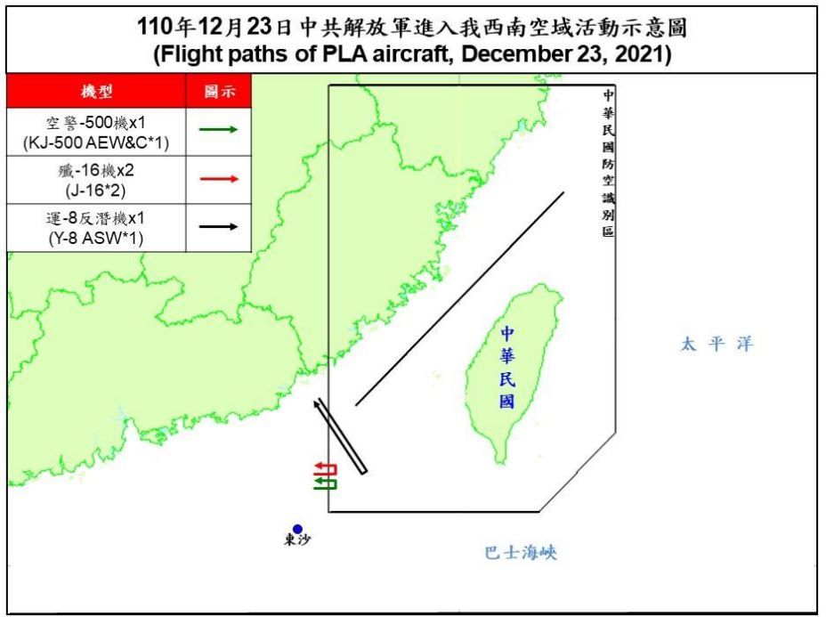 中共解放軍繼22日出動運-8電偵機1架次、運-8遠干機1架次、殲-16機2架次進入我西南空域後,國防部23日證實今再有4架次共機,包括空警-500機1架次、殲-16機2架次、運-8反潛機1架次,我空軍派遣空中巡邏兵力應對、廣播驅離、防空飛彈追監。