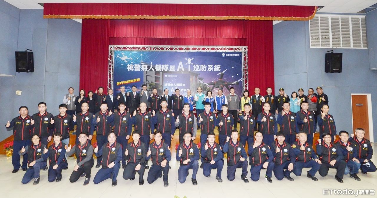 ▲桃園市長鄭文燦(右五)表示,透過無人機隊與AI巡防系統可大大提升辦案效率。(圖/記者沈繼昌翻攝)