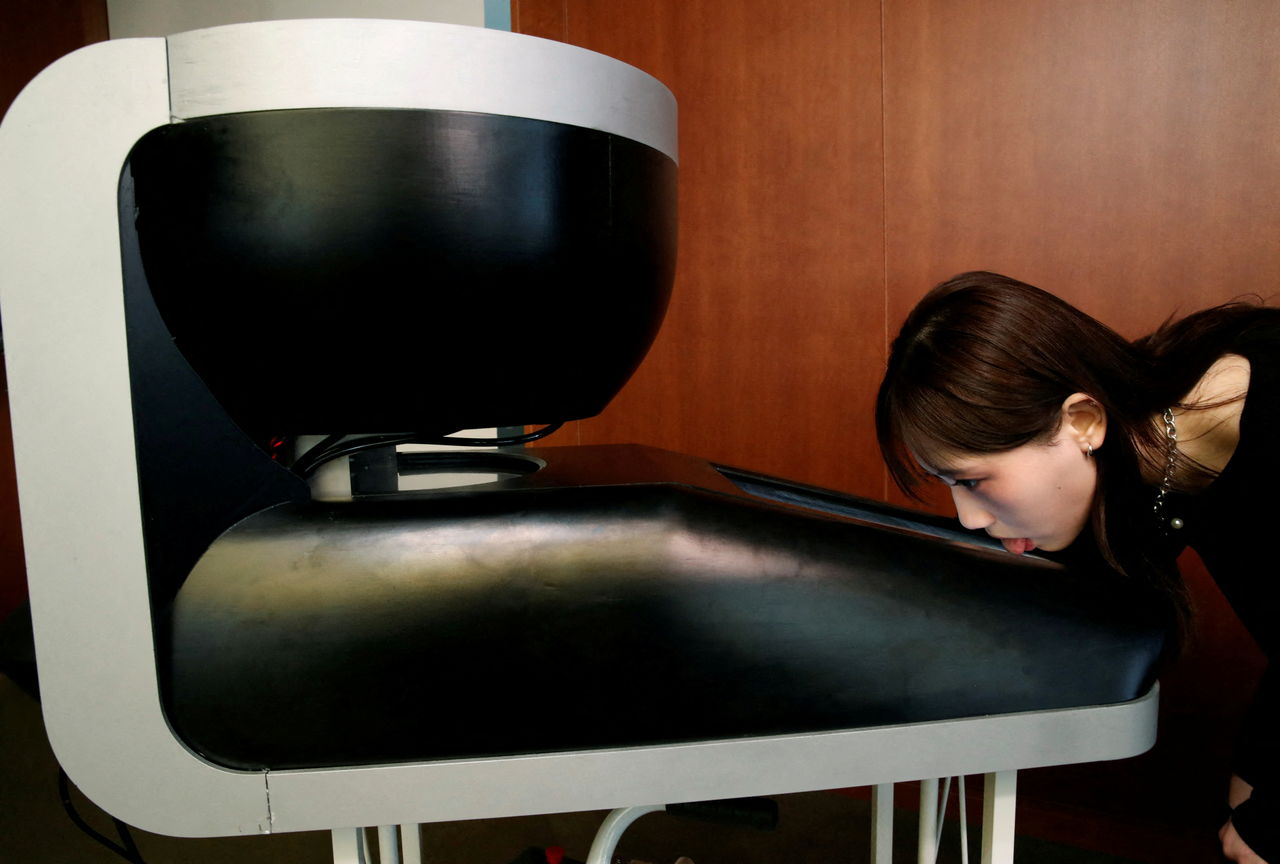 明治大學一名女大生在記者眼前實地測試,她向機器指定要品嘗到巧克力的味道,經過幾番嘗試後,機器總算將調製好的味道噴灑在衛生薄膜上,薄膜也傳送至畫面上,她伸出舌頭舔螢幕後讚嘆道,「像是牛奶巧克力的味道,好甜!」