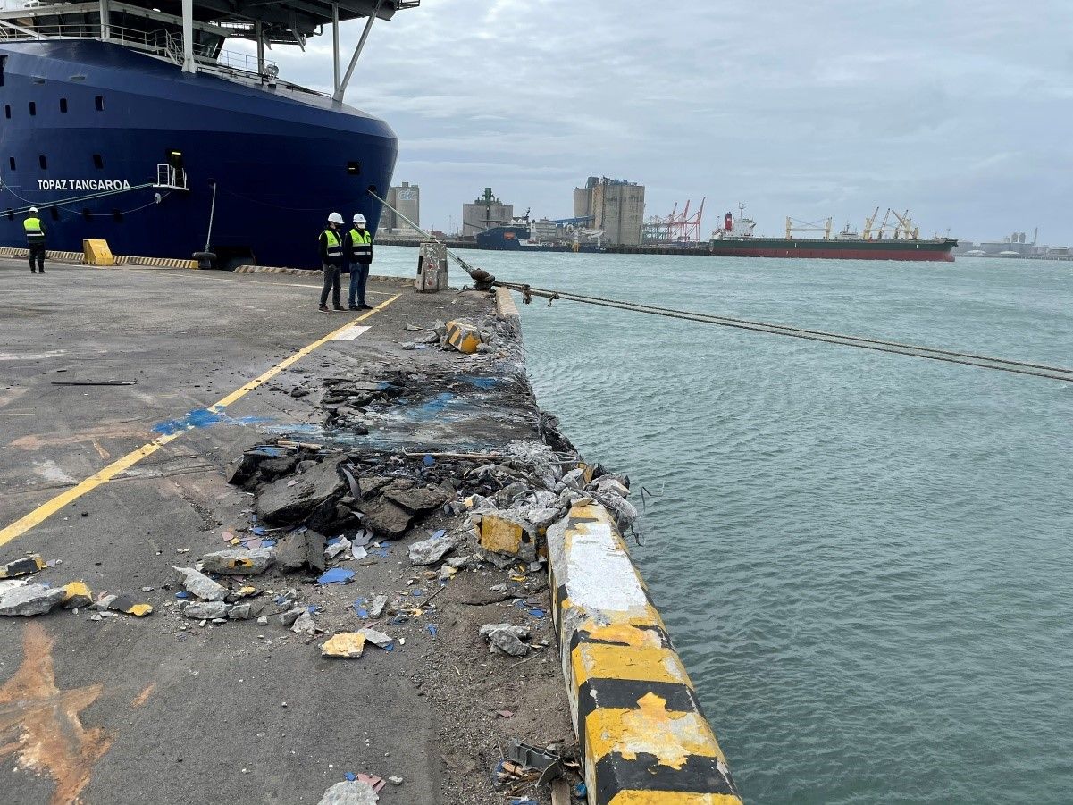 ▲德翔日光輪造成碼頭受損,港務公司要求船東簽署賠償責任切結。(圖/港務公司台中分公司提供)