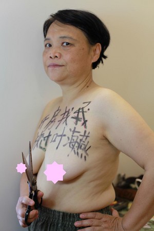 ▲知名學者、獨立片導演艾曉明半裸抗議,在身上寫著「開房找我,放過葉海燕」。(圖/取自艾曉明推特)