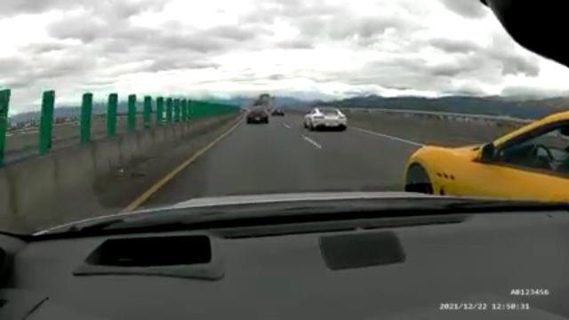 ▲黃色瑪莎拉蒂行駛路肩後,左偏至內側車道逼車,受害車一度疾駛離去,瑪莎拉蒂又追上來繼續逼車。(圖/擷自《爆料公社》,下同)