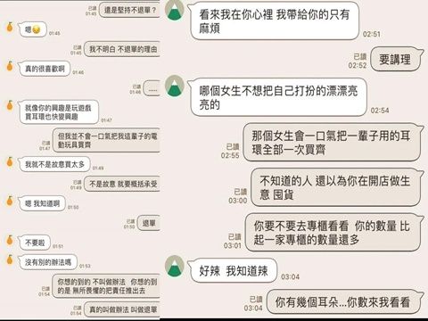 雙方最後開始有情緒,女方質問原PO「看來我在你心裡,帶給你的只有麻煩」,直言「哪個女生不想把自己打扮的漂漂亮亮」,原PO不甘示弱回擊,「哪個女生會一口氣把一輩子用的耳環一次買齊」,並表示女友買的數量之多,甚至會讓不知道的人,還以為女友在開店做生意,「你要不要去專櫃看看,你的數量比一家專櫃還多」,女友也是不耐煩的回答「好辣(啦),我知道辣(啦)」,留下原PO無奈講理,「妳有幾個耳朵,妳數來我看看」。