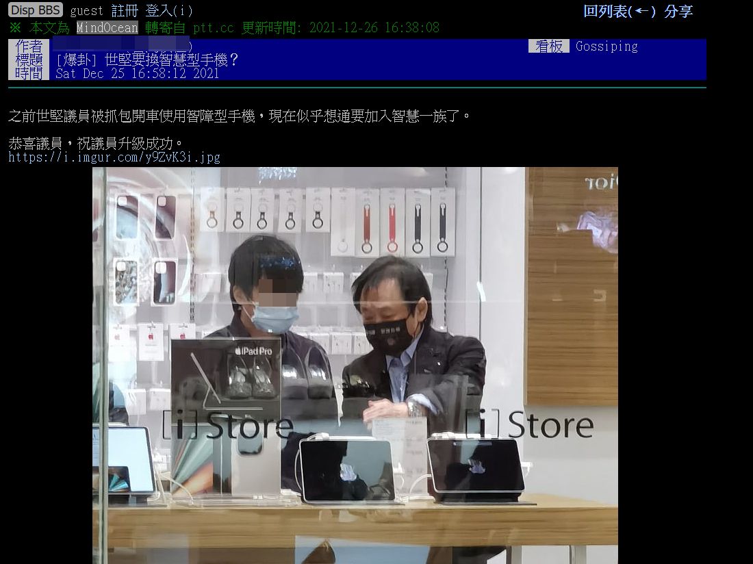 ▲王世堅被網友捕捉到逛蘋果手機專賣店。(圖/翻攝PTT)