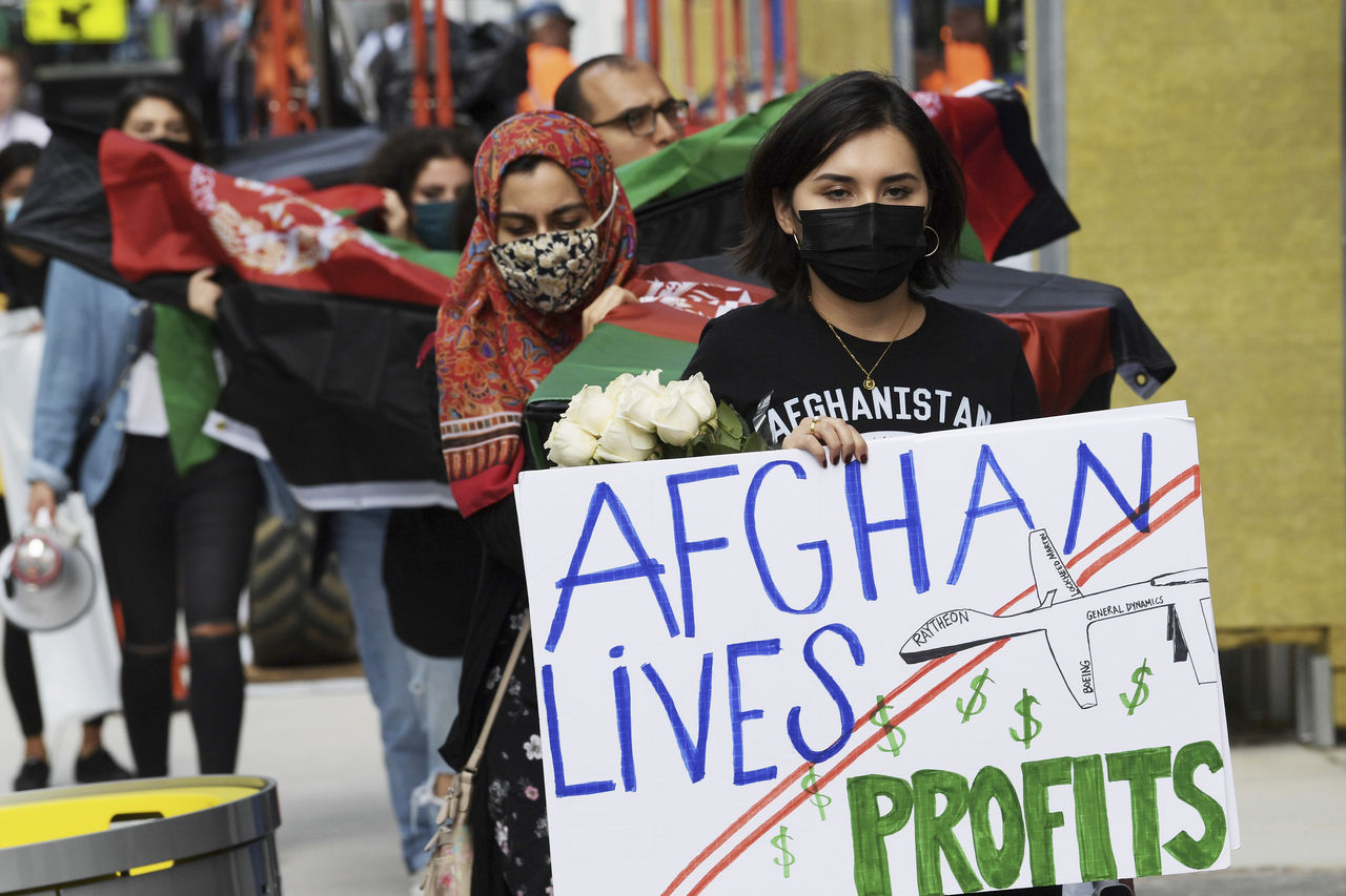 ▲阿富汗戰爭20週年之際穆斯林組織在美國軍武商雷神公司(Raytheon Technologies Corporation)前抗議。(圖/達志影像/美聯社)