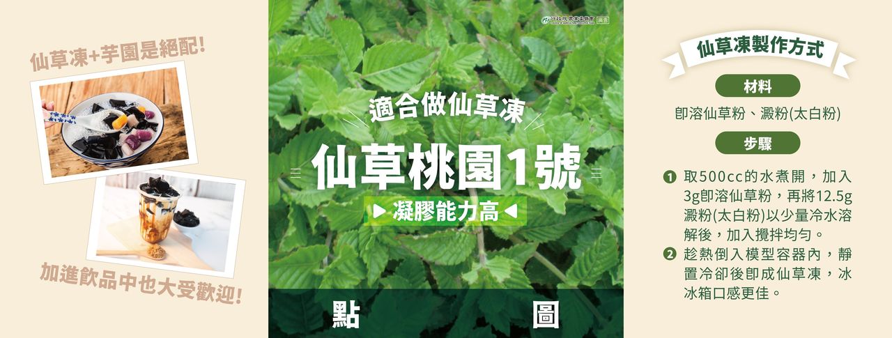 農委會指出,不同品種的仙草有不同特性,製作出來的食品樣態也不一樣,如仙草桃園1號和仙草農試1號,凝膠能力高,適合做仙草凍、桃園2號香氣濃郁,則適合變成仙草茶,至於營養成分,農委會表示,含鉀、鈣、磷、鎂、錳、鐵、蛋白質、脂質、灰分、醣類。