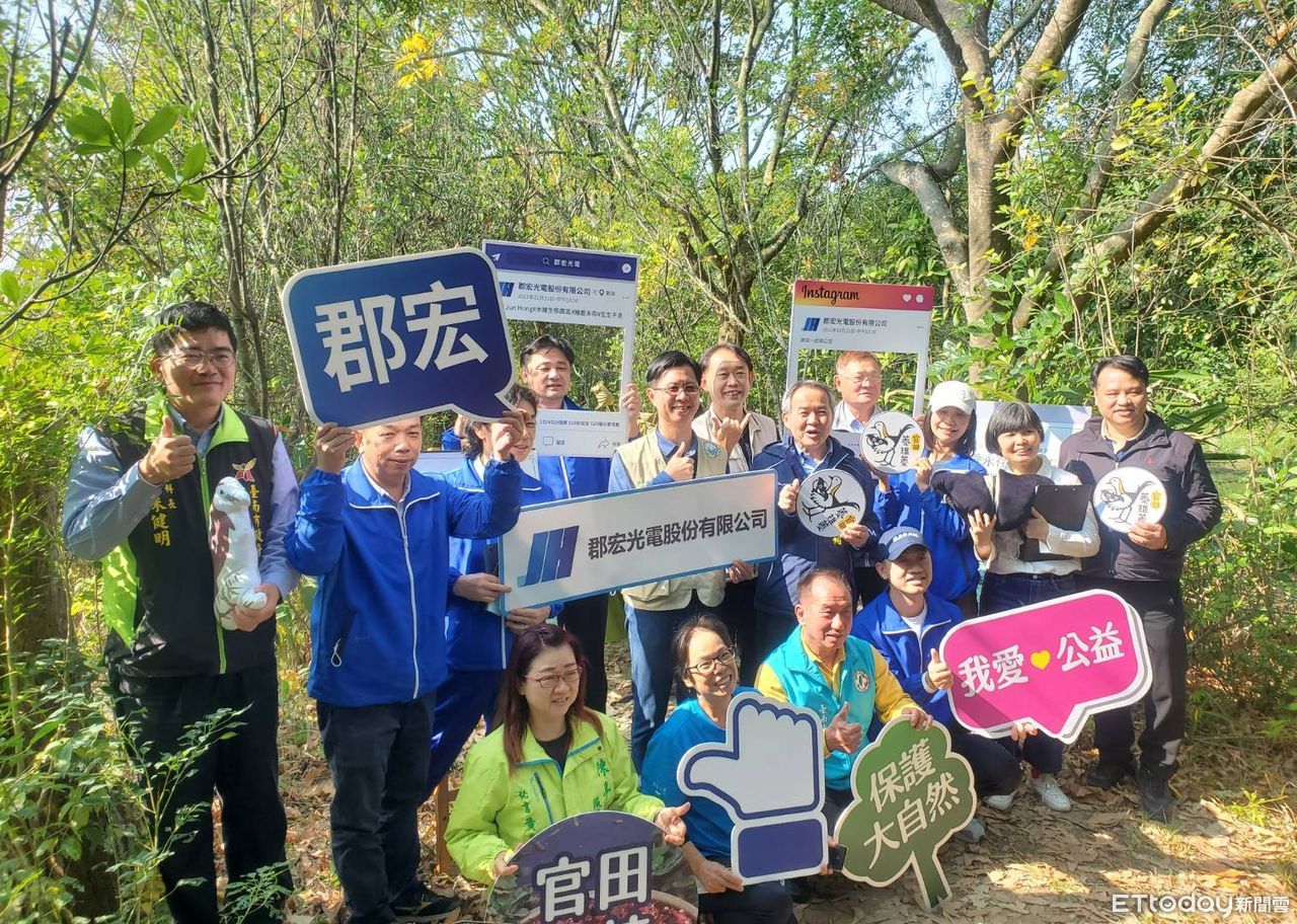 ▲郡宏光電董事長林勇任和副董事長呂昕晨,與員工一同為水雉棲地整理環境,同時宣布合作推動「『雉』愛永存、生生不息」計畫,進一步協助園區協助推廣水雉保育和生態教育。(圖/記者林悅翻攝,下同)