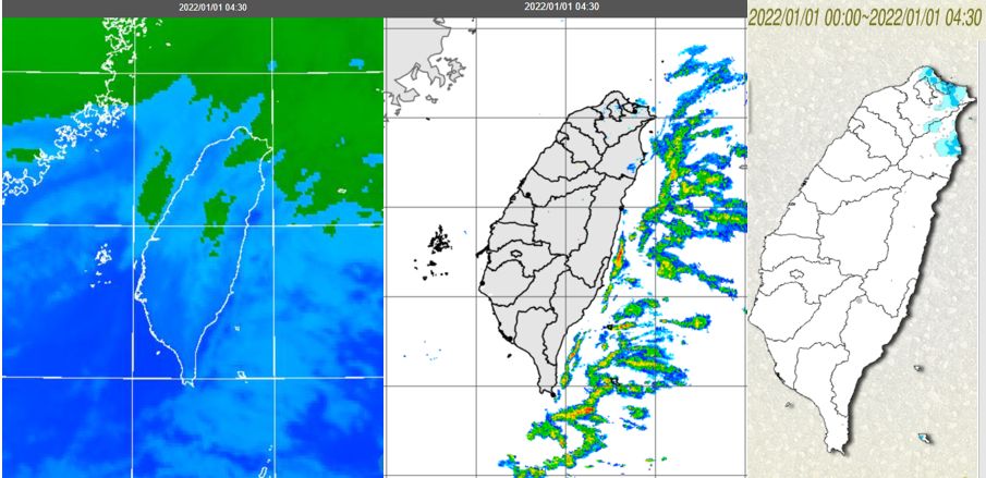▼今(1)日4:30紅外線色調強化雲圖顯示,迎風面北部及東部海面有較多的低雲,海峽北部亦有一些(左圖);4:30雷達回波合成圖顯示,東側海面有較多的回波(中圖);今晨北海岸、大台北東側及宜蘭有局部雨(右圖)。(圖/翻攝三立準氣象· 老大洩天機)