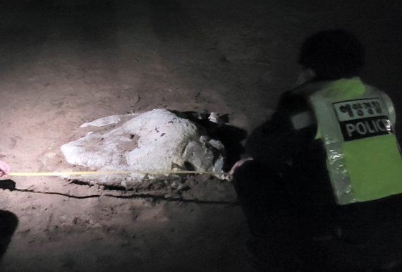 ▲濟州島民眾1日晚間在海灘上發現一具嚴重腐爛的「屍體」。(圖/濟州海洋警察署)