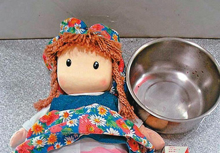 ▼檢警以布娃娃充當女童,並在裝水的鍋中加入紅墨汁,模擬案發經過。