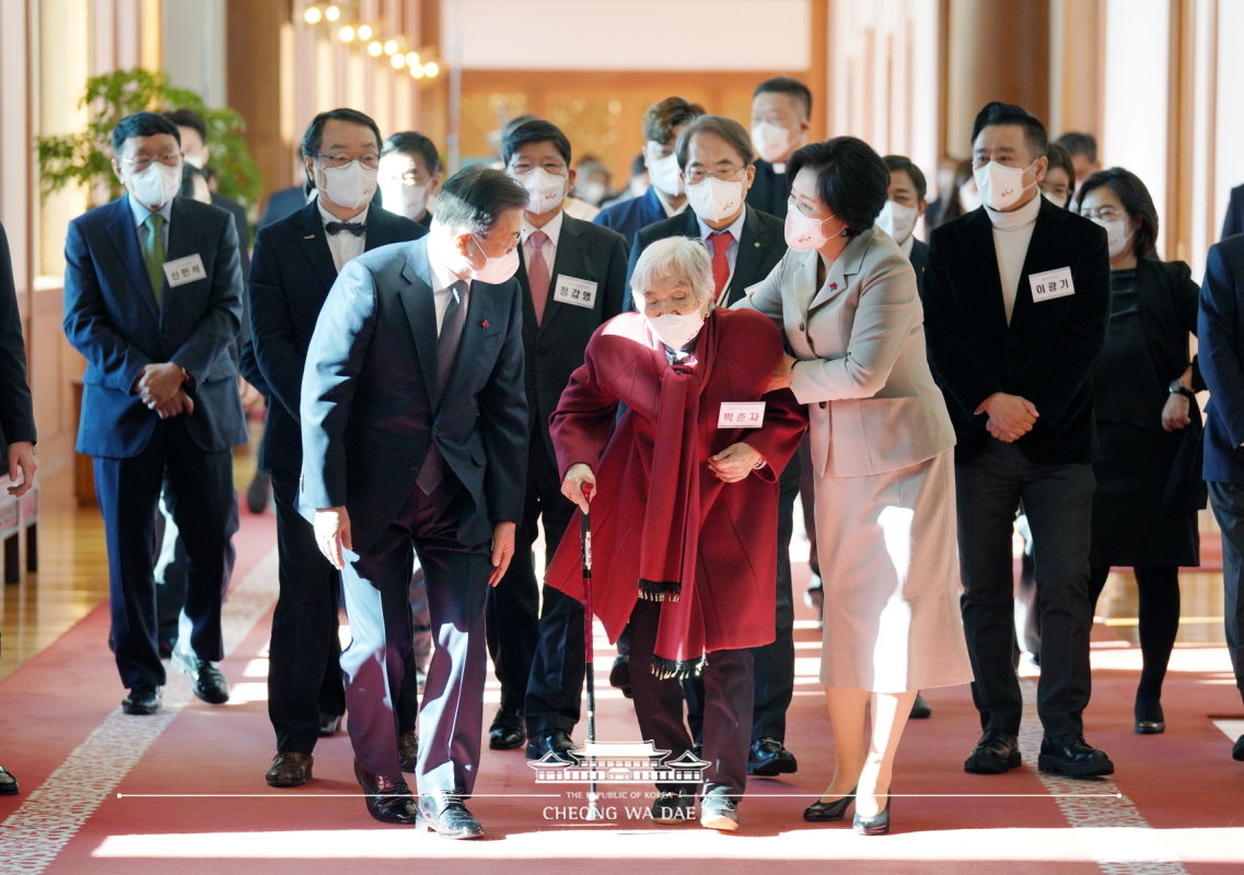 ▲ 南韓92歲老奶奶朴春子捐出一生積蓄,12月3日到青瓦台接受表揚。(圖/青瓦台)