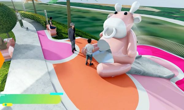這個埤塘公園為何這麼多牛?桃園市長鄭文燦3日出席位於青埔公2公園的「桃園大圳5-5號池綠美化景觀工程暨裝置藝術」開工典禮表示,5-5號池原舊名「赤牛稠」。因此,未來公園入口處設置童趣吉祥物「赤牛牛」,園內還有座牛造型的溜滑梯,以及380公尺景觀步道等設施,今年7月完工後將命名為「青禾藝術公園」。