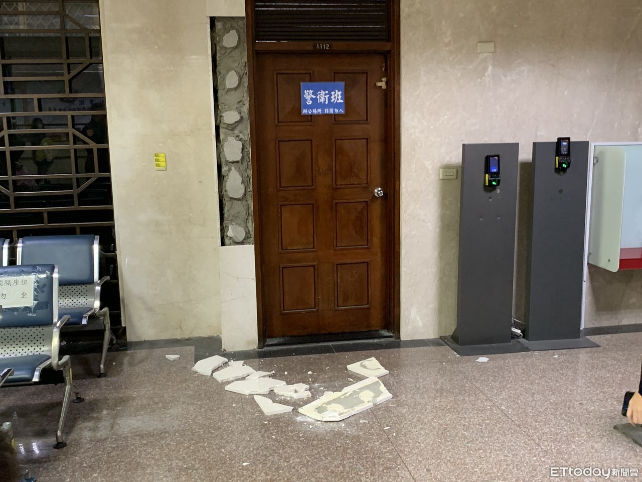 ▲北檢法警室前方的磁磚因地震搖晃剝落。(圖/記者劉昌松攝)
