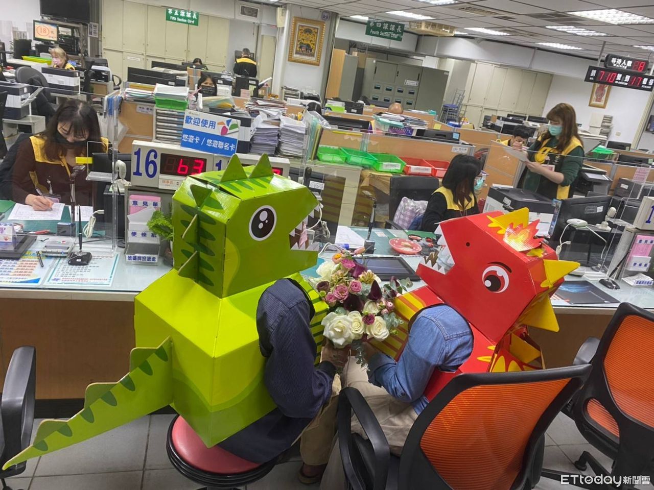 新北市板橋區戶政事務所5日上午出現一對開著恐龍車、穿恐龍裝的新人,要來登記結婚,有別於一般穿著白紗、西裝或是中式龍鳳褂,來洽公的民眾看到,覺得相當逗趣,紛紛圍觀搶拍照,讓戶所充滿喜氣及歡樂。