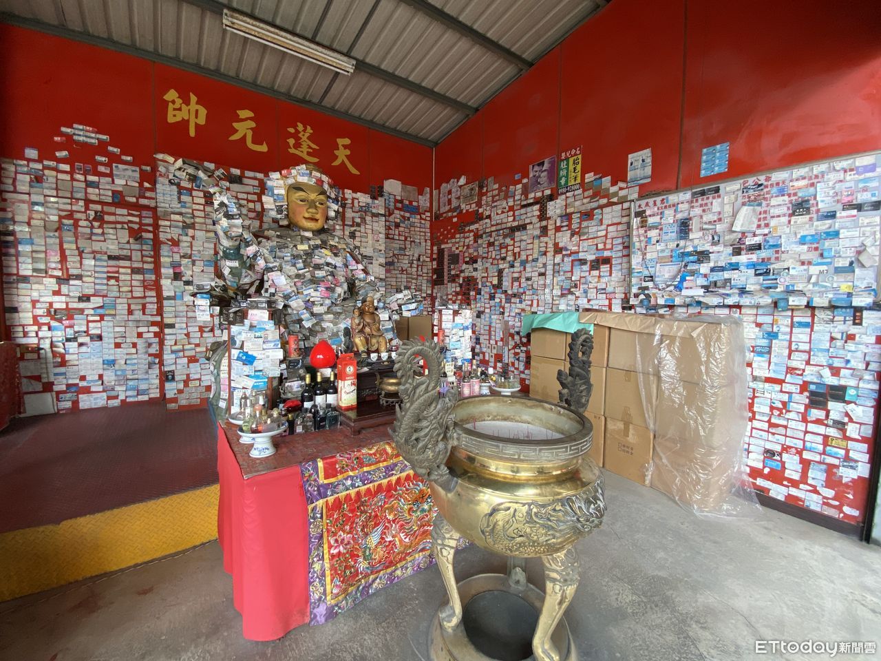 但在廟內還有一尊特殊的財神天蓬元帥,祂的身上和神壇周邊都被貼滿了各式各樣的名片,仔細一看,很多都是八大行業的從業人員,但也有業務人員貼上名片,希望生意旺旺來。