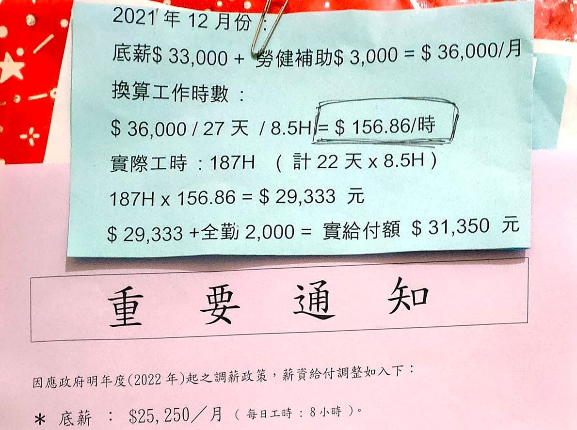 照片中可見,該業者2021年12月的薪水是這樣算的,底薪3萬3000元加勞健補助3000元,一個月是3萬6000元;業者改以時薪換算,以每個月上班27天、一天上班8.5小時來計算,時薪約為156.86元,實際薪水則為3萬1350元。