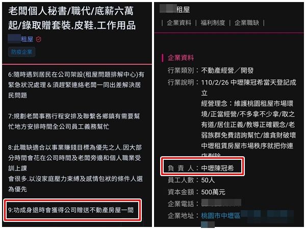 其中,該名老闆在某人力銀行以「老闆個人秘書/職代/底薪6萬起」等徵人,要求面試者要會化妝打理門面,且對自身穿著有品味,公司也會出資安排上美姿美儀等課程,且學經歷、科系都不拘,最後在文末提及「功成身退時會獲得公司贈送不動產房屋一間」。