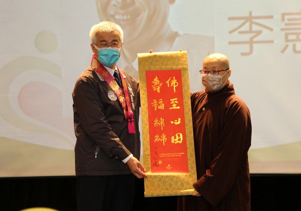 ▲靈鷲山寶月法師致贈開山住持心道法師虎年墨寶給市府,由副市長李憲明代表接受。(圖/靈鷲山佛教教團提供)