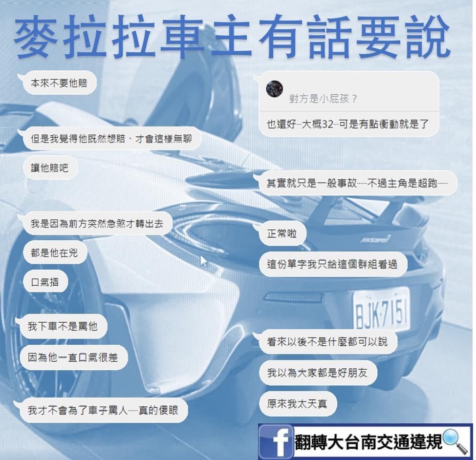 臉書「翻轉大台南交通違規2.0」昨日有網友爆料,「麥拉倫車主有話要說,車主的神邏輯對話,本來很大方不用對方賠,但對方太ㄐ車(機車)了,才勉為其難地求償,原影片看起來麥拉拉車主比被撞的還激動......。」